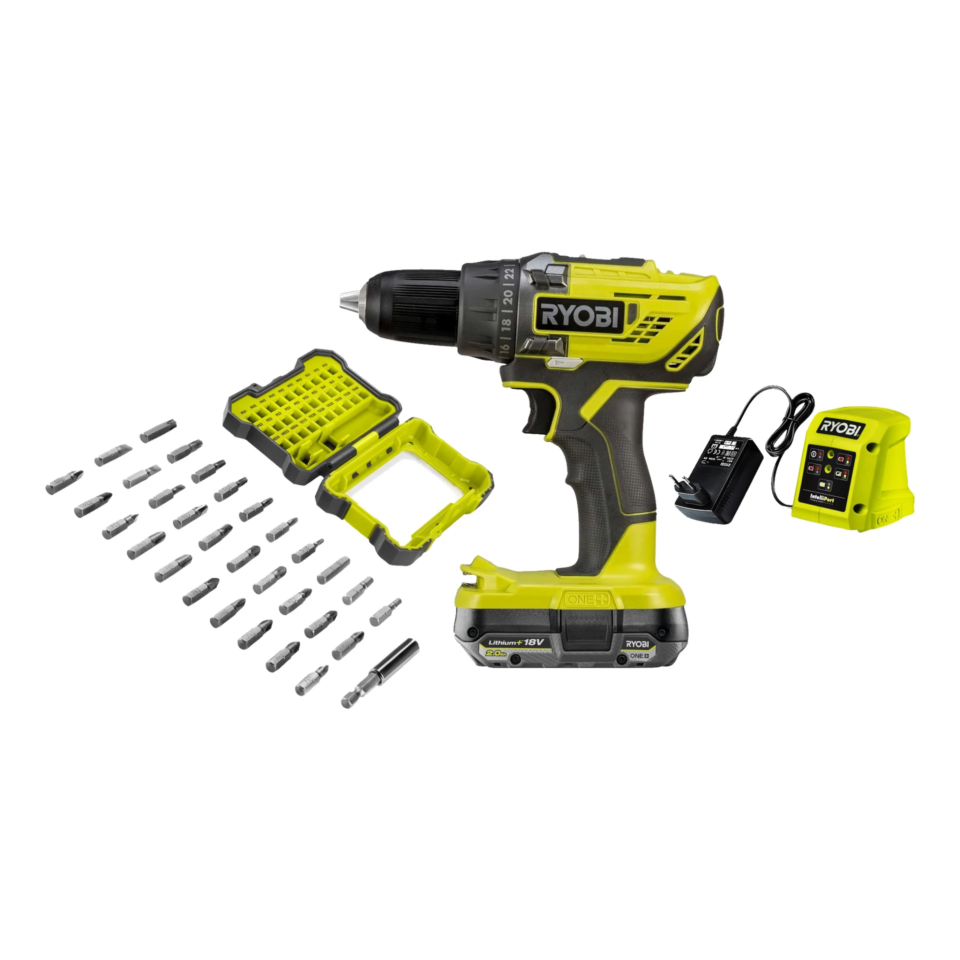 Tvåväxlad skruvdragare med bitssats, batteri och laddare. Skruva sladdlöst och effektivt med R18DD3- 1C20GA31J från Ryobi ONE+! Med två växlar, 24 momentlägen och ett vridmoment på 50 Nm fixar du både snabba och mer krävande borr- och skruvuppgifter i trä eller metall. Dessutom ingår batteri, laddare och hela 31 bits så att du kan sätta tänderna i projektet direkt!